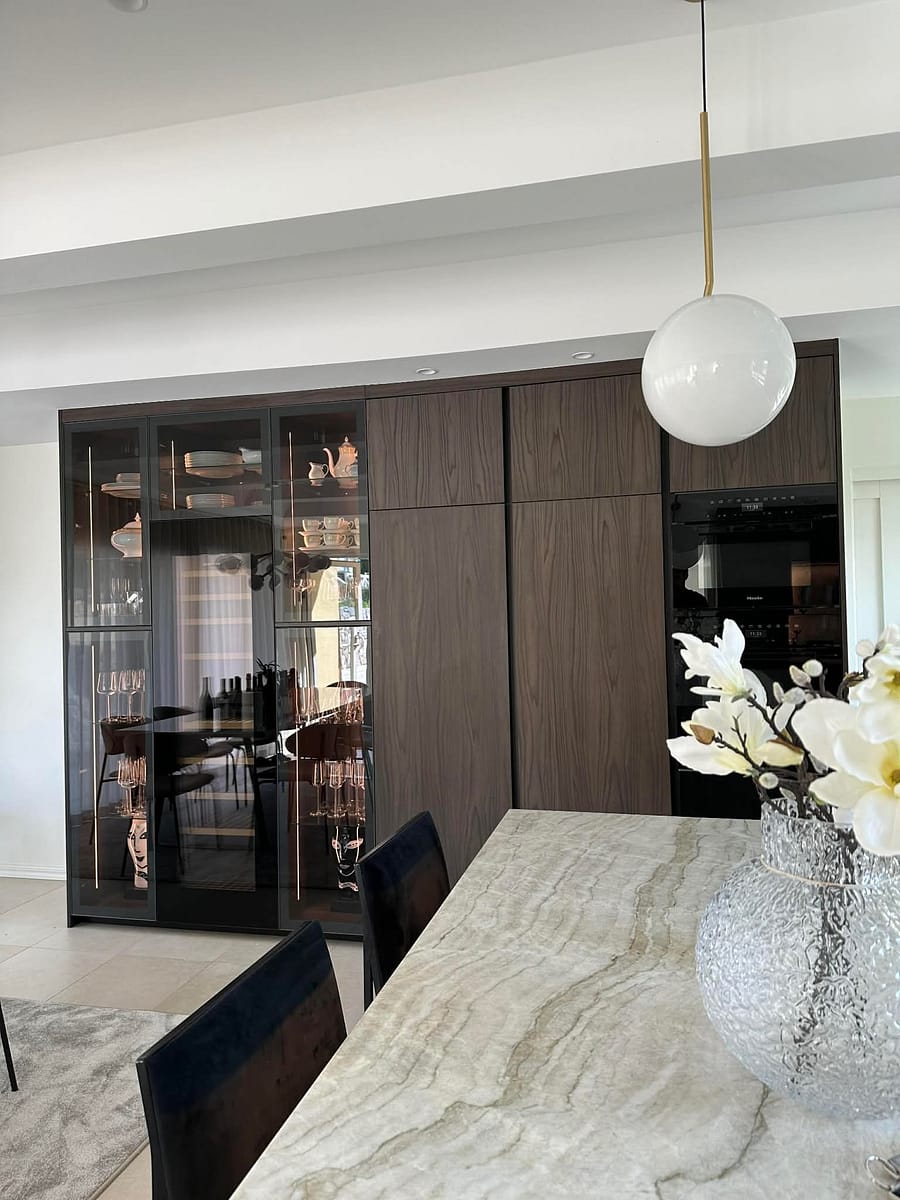 En genomtänkt kombination av vitrinskåp och hela träfronter i väggskåpen, kompletterat med integrerad vinkyl.