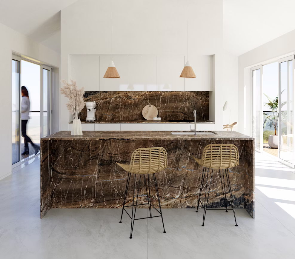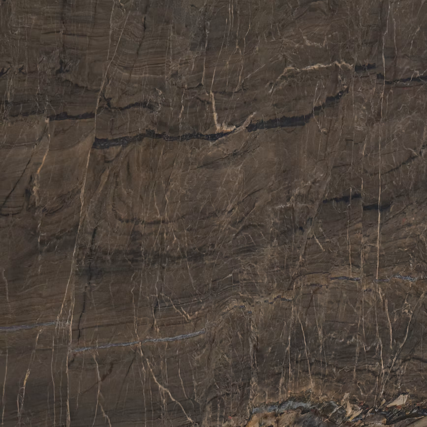 Nahoa – En unik brasiliansk kvartsit med brun bakgrund och svart samt beige marmorering som löper genom den.
