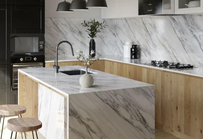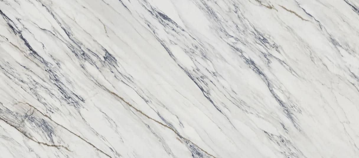 Dekton Trance. En flytande, mjuk färgton med en blåaktig slöja. I bakgrunden anas en kombination av kräm och grått – nyanser som smälter samman inom en vit palett. Tunna stråk rör sig mellan oxidtoner och övergår subtilt i rödguld.