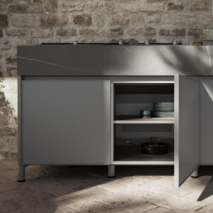Den robusta konstruktionen kombineras med en genomtänkt design som gör köket lika praktiskt som estetiskt tilltalande. Aura är kompakt men komplett, med generösa arbetsytor och smart förvaring som gör matlagningen smidig även utomhus.